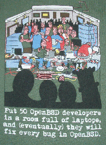The event space and accommodation is typically funded by donations to the OpenBSD Project, or by the OpenBSD Foundation, however most developers pay for their own travel. The facilities are always chosen to be highly economical; generally near Universities or in cheaper locales. If anyone wants to help us FUND ONE OF THESE EVENTS OR A DEVELOPER'S TRAVEL, please contact Theo de Raadt (who generally has the most knowledge about upcoming options), or directly offer travel expenses to a developer for the next event. General financing is more interesting, but we will entertain offers for free locations as well.